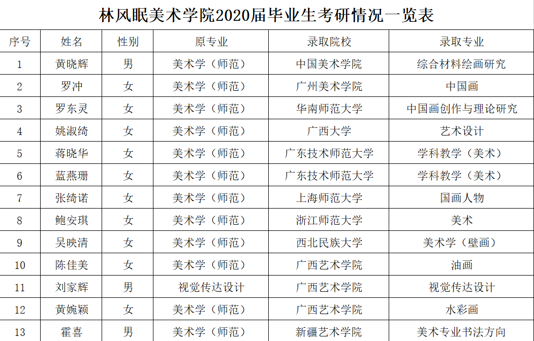 林风眠美术学院2020届毕业生考研情况一览表