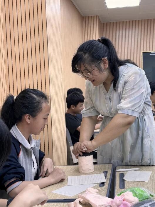 陶土在指尖堆叠成围龙屋的弧形瓦檐,榫卯结构与排水系统精密还原。张鸿飞老师点拨道:“土楼圆形布局暗含客家人‘聚族而居,御险同心’的智慧。”
