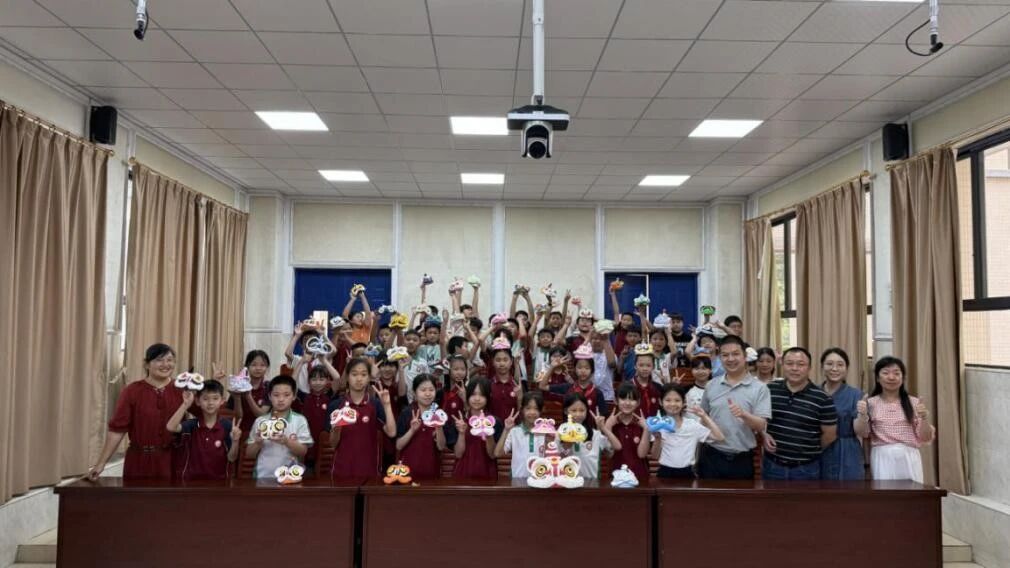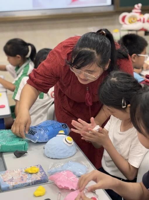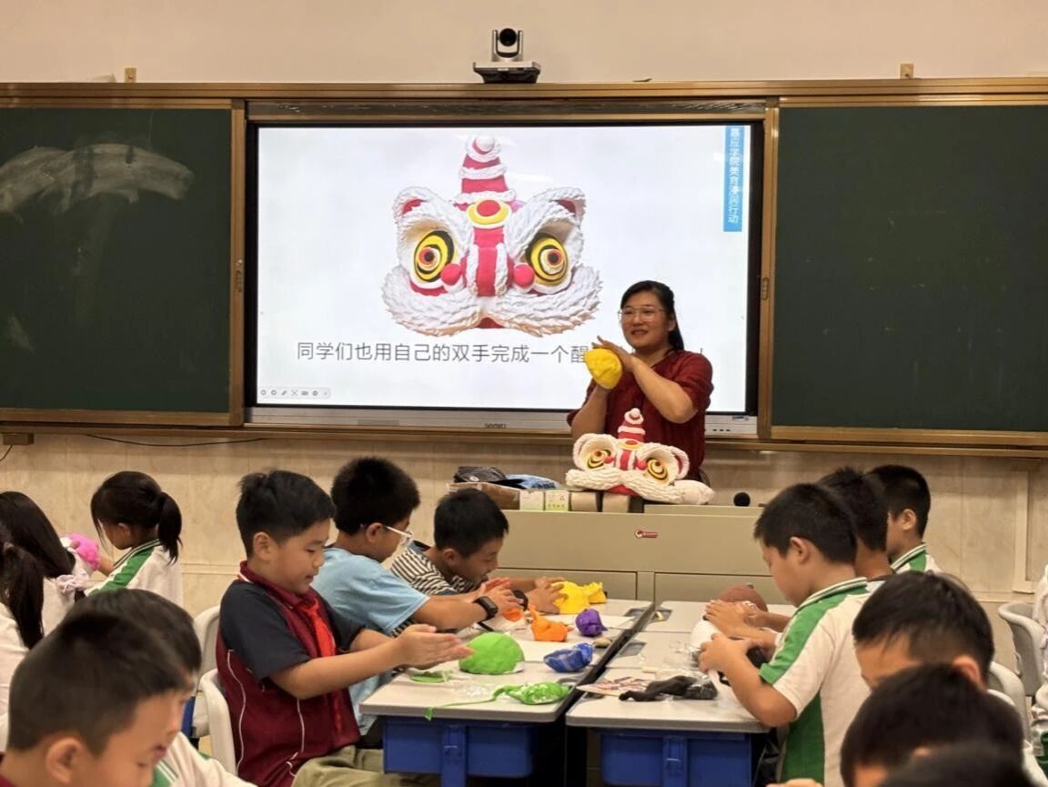 孩子们揉捏彩泥,朱砂点睛、金粉描须,岭南醒狮的威武神韵在黏土中重生。张鸿飞老师穿梭指导:“在制作醒狮过程中,感悟岭南醒狮的民族之魂。”