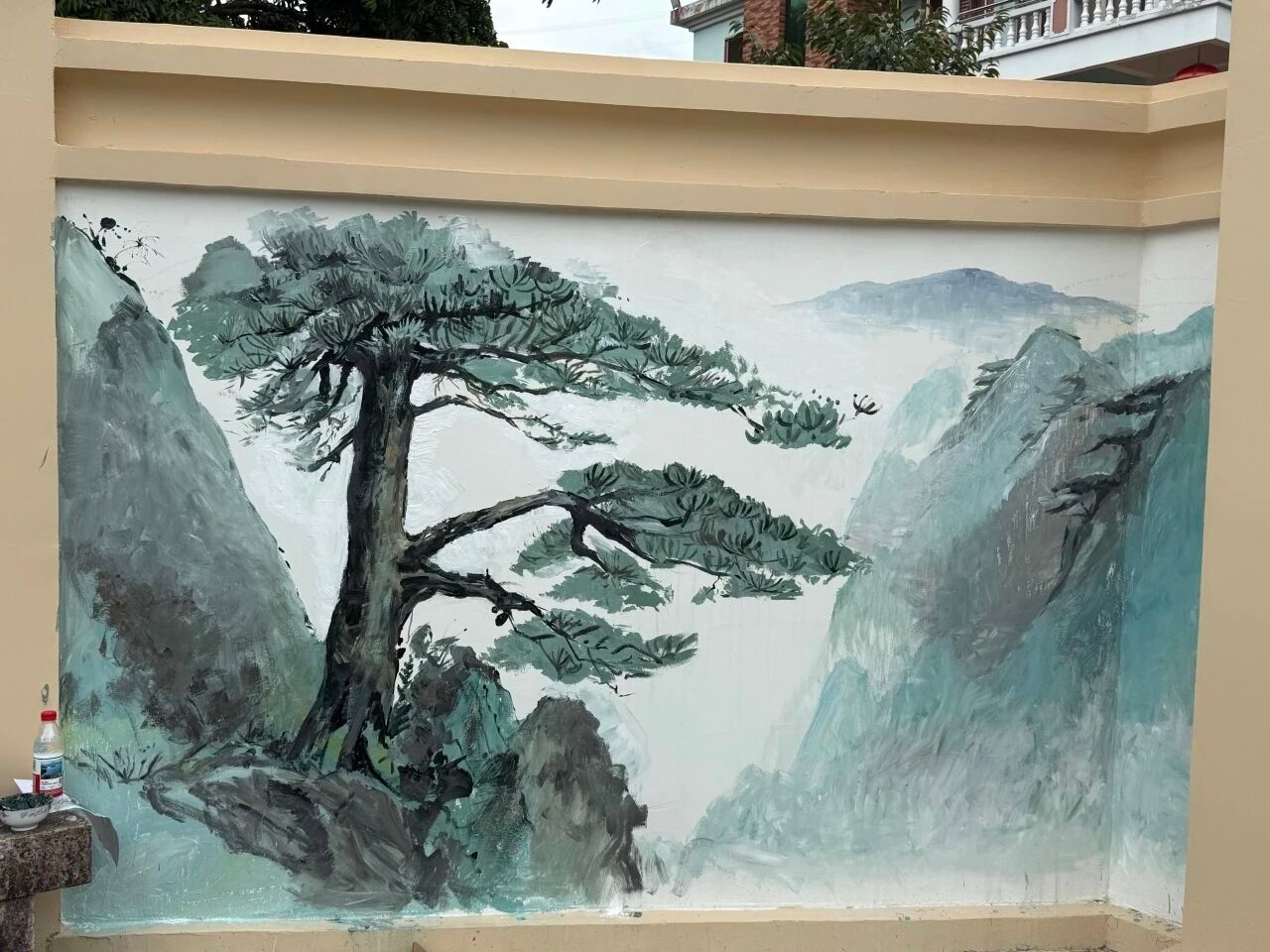 活动现场,师生们以大龙华镇田东村标志性自然景观 —— 鹰嘴峰山形为灵感原点,将传统山水画的意境、民俗住居的独特元素巧妙融入墙绘创作。他们手持画笔,在村舍墙面上勾勒出一幅幅灵动的画卷:青石板路蜿蜒曲折,小桥下流水潺潺,岸边屋舍错落有致,粉墙黛瓦在绚丽色彩的渲染下焕发出勃勃生机。