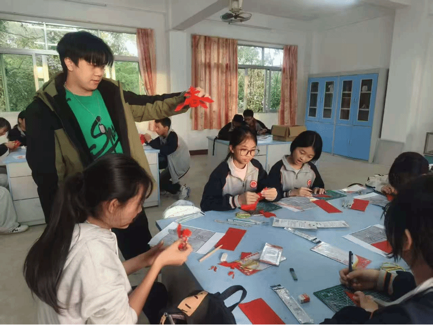 在剪纸教学中,实习同学们耐心指导,从折纸、画样、运剪、修整,到勾勒线条、镂空纹样,每一个步骤都细致入微。教室里,剪刀的咔嚓声与孩子们的欢声笑语交织,原本素净的红纸在孩子们的巧手下,变成了灵动的花鸟、吉祥的团花。每一件作品都蕴含着孩子们独特的想象力和专注力,展现出他们对美的追求与创造。
