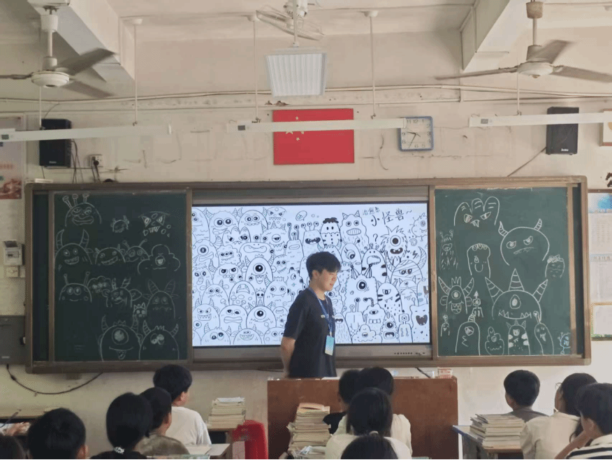 嘉应学院美术学院的实习同学们怀揣着对教育事业的无限热忱,投身于潘田中学的教育实践课堂。他们化身尽职尽责的“小老师”,引领孩子们走进丰富多彩的美术世界。课堂上,实习同学们从基础绘画技巧入手,逐步引导孩子们进行创意手工设计。他们用生动有趣的方式讲解知识,极大地激发了孩子们的学习兴趣和创作欲望。