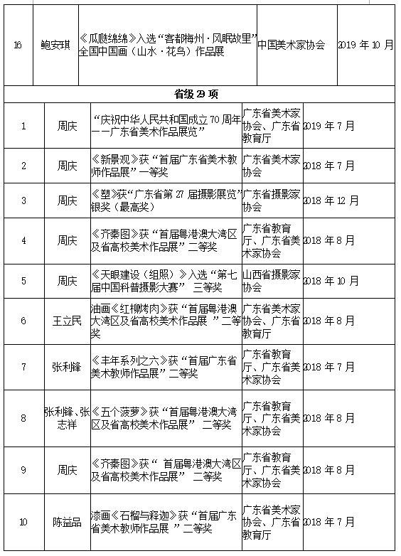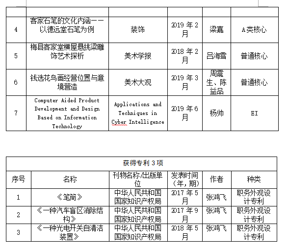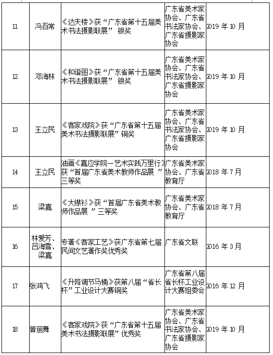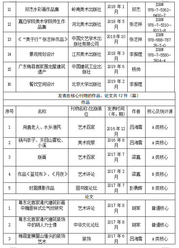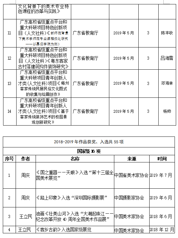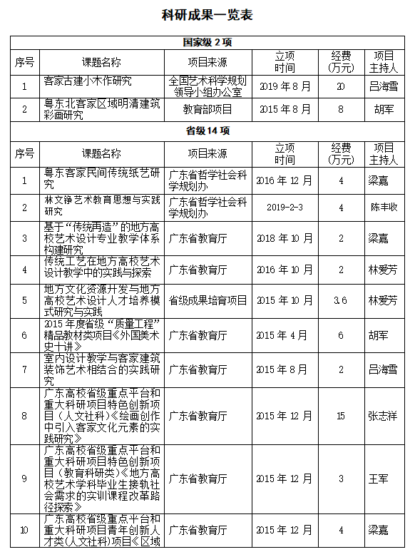 近几年,我院在课题申报、美术作品创作都取得喜人的历史性突破。在课题方面,有省级课题14项,教育部项目1项,国家社科艺术基金1项。我院的吕海雪老师申报的课题“客家古建小木作研究”(19BG109)获得2019年度国家社科基金艺术学项目立项资助,这是我院也是我校首次突破国家社科基金艺术学项目。