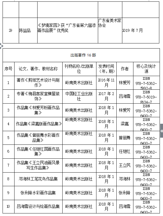 出版著作、教材、作品集16部;发表核心论文12篇;获得专利3项。