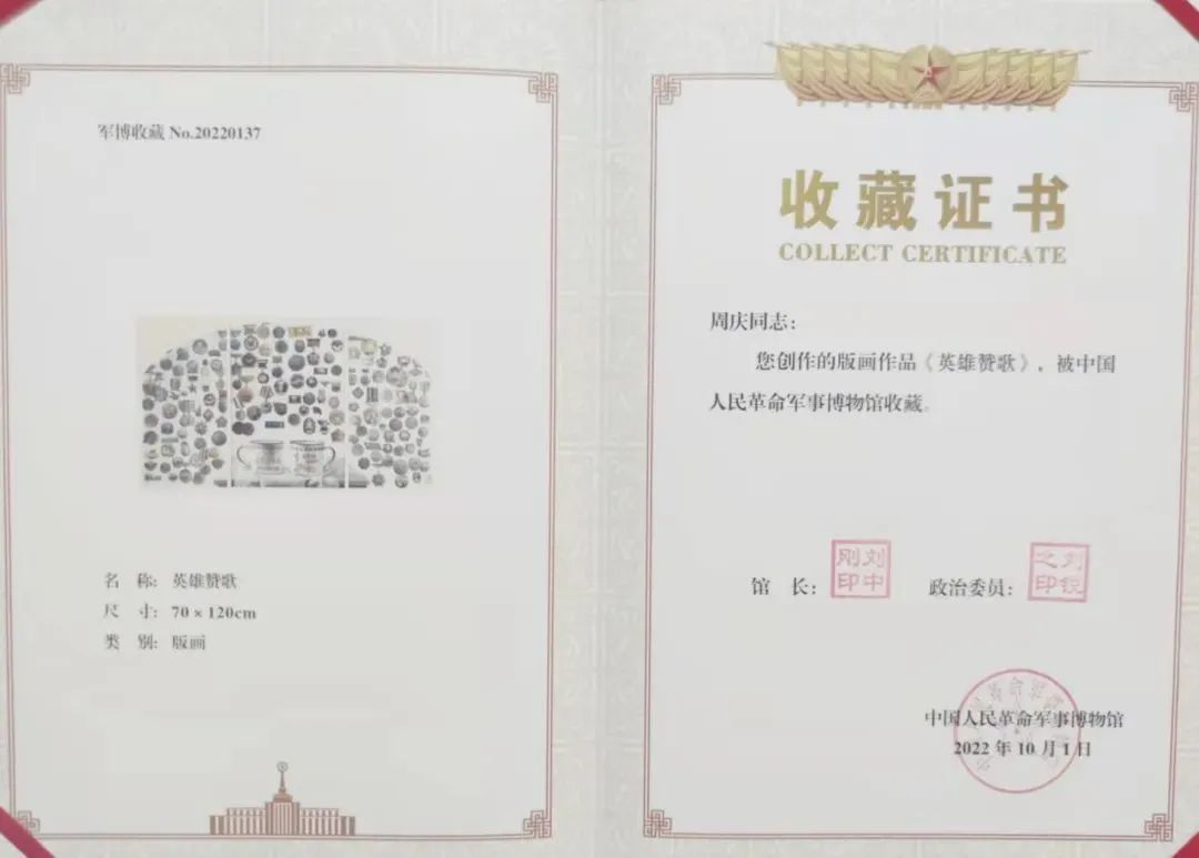 近日,为喜迎党的二十大胜利召开,“庆祝中国人民解放军建军95周年全国美术作品展览暨第15届全军美术作品展览”在北京中国美术馆开幕。我院周庆教授的版画作品《英雄赞歌》入选展览,并被中国革命军事博物馆收藏。