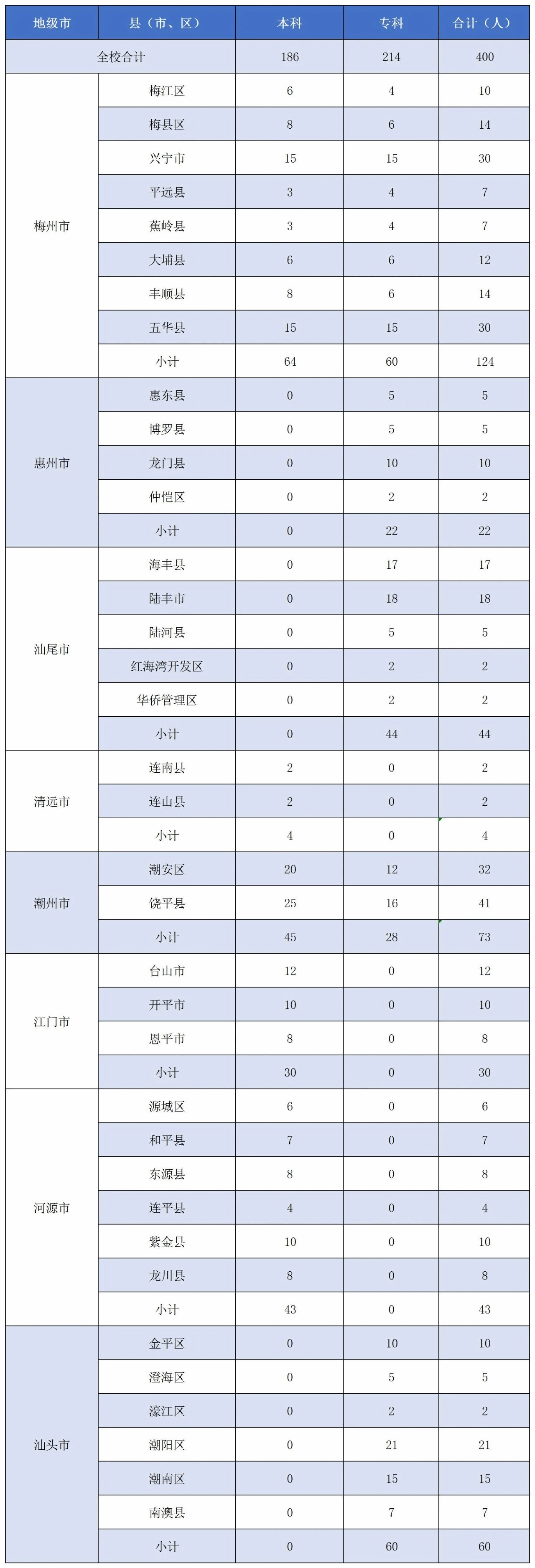 2021年我校订单定向培养临床医学专业医学生招生计划400个,包括本科计划186个,专科计划214个。定向地区涵盖梅州市、惠州市、汕尾市、清远市、潮州市、江门市、河源市、汕头市。具体招生计划详见下表《嘉应学院2021年订单定向临床医学专业医学生培养计划表》。