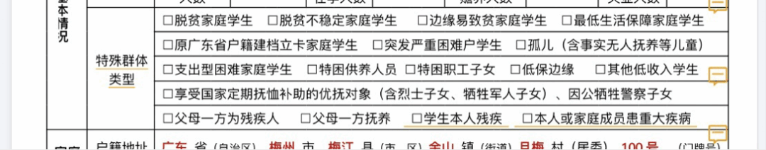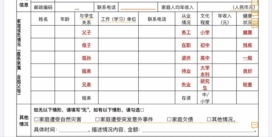 ④家庭情况:此处四项如实填写,以学生信任优先原则执行,不强制要求提交证明材料。若人数为1,则填写“1”