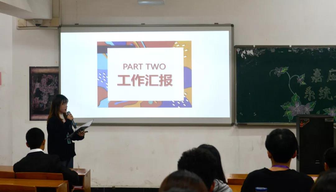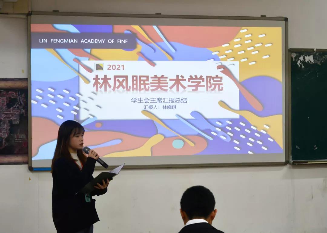 林晓琪同学对林风眠美术学院学生会今年开展的工作及活动进行了汇报总结,例如学生会思想政治建设、学生会骨干队伍建设、学生会工作等,同时指出了林风眠美术学院学生会在工作中的不足之处。