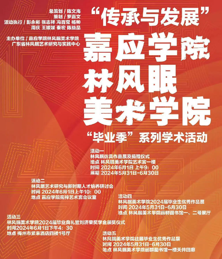 5月31日——6月30日林风眠美术学院2024届毕业生优秀作品展于嘉应学院林风眠美术学院丽群图书馆一、二号展厅展览。