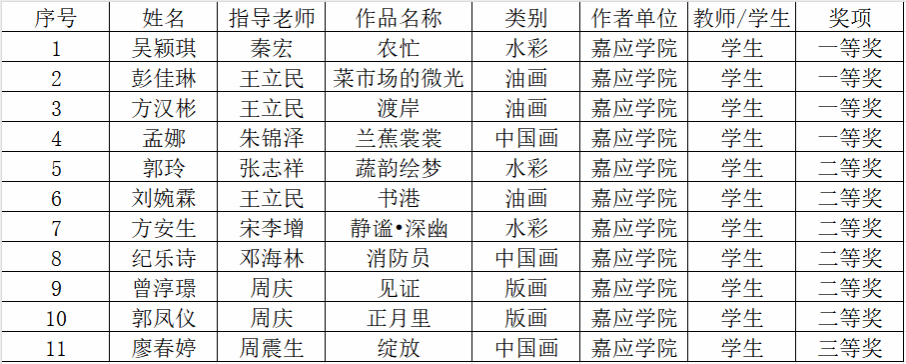 在学生组中,吴颖琪(指导教师:秦宏)的水彩作品《农忙》、彭佳琳(指导教师:王立民)的油画作品《菜市场的微光》、方汉彬(指导教师:王立民)的油画作品《渡岸》、孟娜(指导教师:朱锦泽)的中国画作品《兰蕉裳裳》均获得一等奖。郭玲(指导教师:张志祥)的水彩作品《蔬韵绘梦》、刘婉霖(指导教师:王立民)的油画作品《书港》、方安生(指导教师:宋李增)的水彩作品《静谧·深幽》、纪乐诗(指导教师:邓海林)的中国画作品《消防员》、曾淳璟(指导教师:周庆)的版画作品《见证》、郭凤仪(指导教师:周庆)的版画作品《正月里》荣获二等奖。廖春婷(指导教师:周震生)的中国画作品《绽放》则获得三等奖。