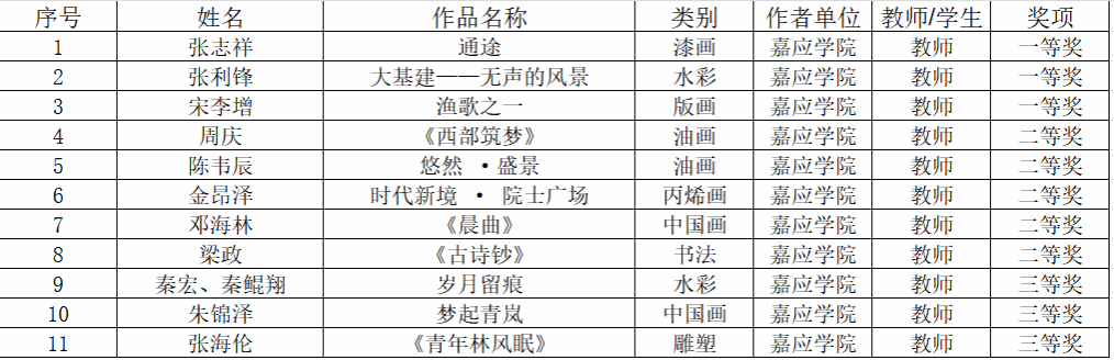 在教师组中,张志祥的漆画作品《通途》、张利锋的水彩作品《大基建——无声的风景》、宋李增的版画作品《渔歌之一》荣获一等奖。周庆的油画作品《西部筑梦》、陈韦辰的油画作品《悠然·盛景》、金昂泽的丙烯画作品《时代新境·院士广场》、邓海林的中国画作品《晨曲》、梁政的书法作品《古诗钞》获得二等奖。秦宏、秦鲲翔合作的水彩作品《岁月留痕》、朱锦泽的中国画作品《梦起青岚》、张海伦的雕塑作品《青年林风眠》则荣获三等奖。