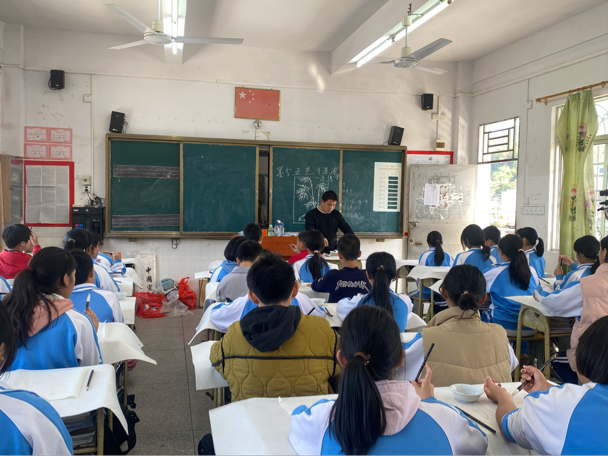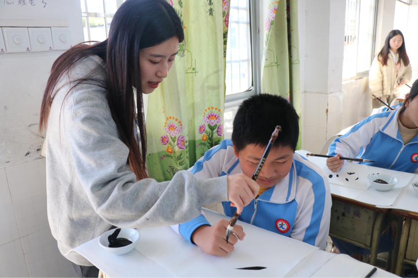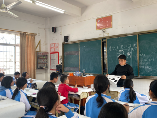同时,林风眠美术学院朱锦泽博士还为当地师生带来一场精彩的国画教学实践公开课。课程包括对绘画对象的结构分析,对国画用笔基本技法的掌控,物体虚实大小,主体物的练习等内容。朱老师在教学中示范绘制一幅国画作品,而后与其他美育浸润行动小组组员对该班学生进行辅导。